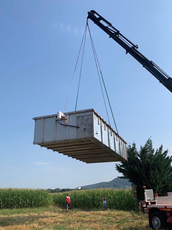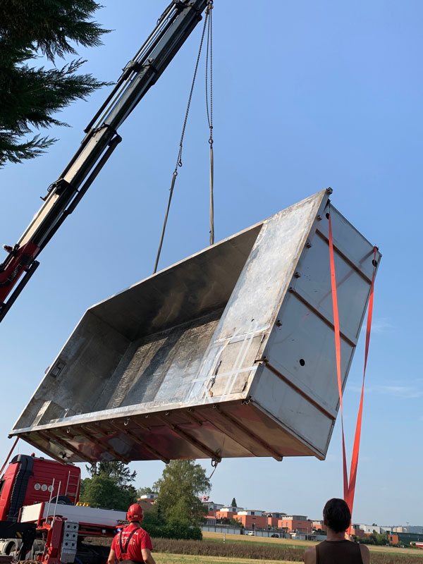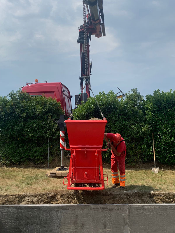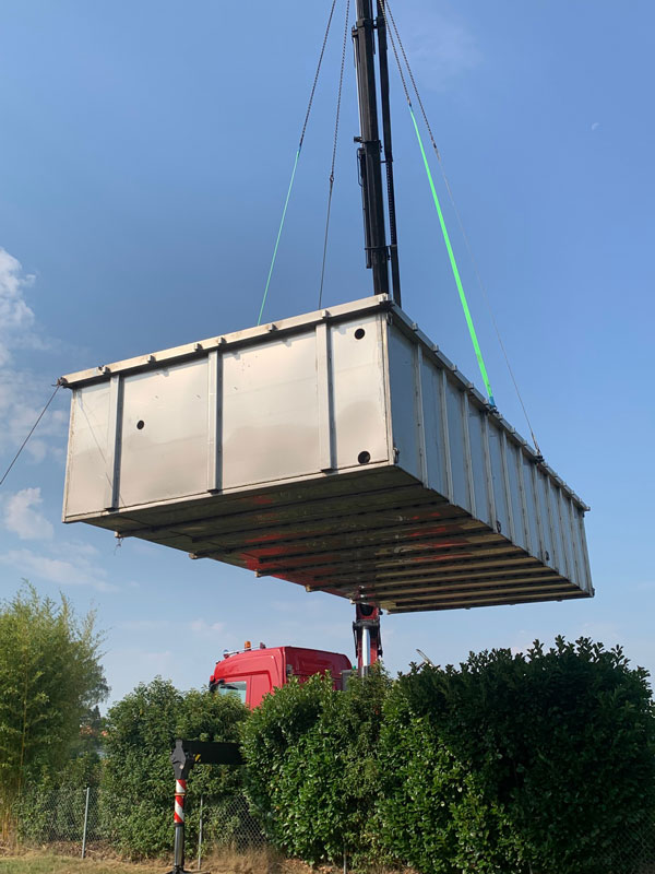 La consegna viene effettuata con un camion a basso carico e un'autogru e richiede circa 5 ore con tutto il ghiaiamento.