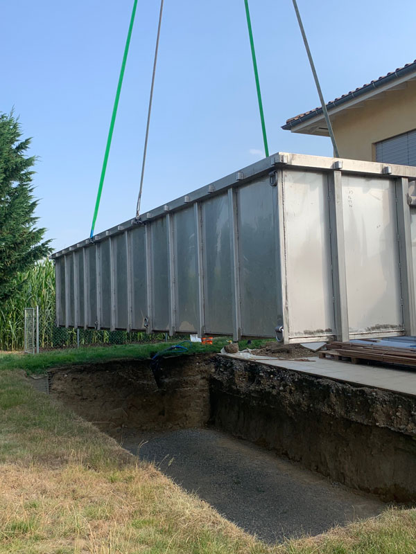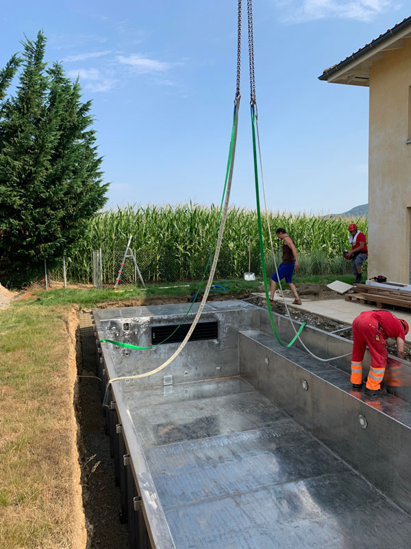 La vasca della piscina e il locale tecnico sono integrati in un container. Tutto è realizzato in puro acciaio inossidabile di altissima qualità, saldato, con uno spessore di 3 mm.